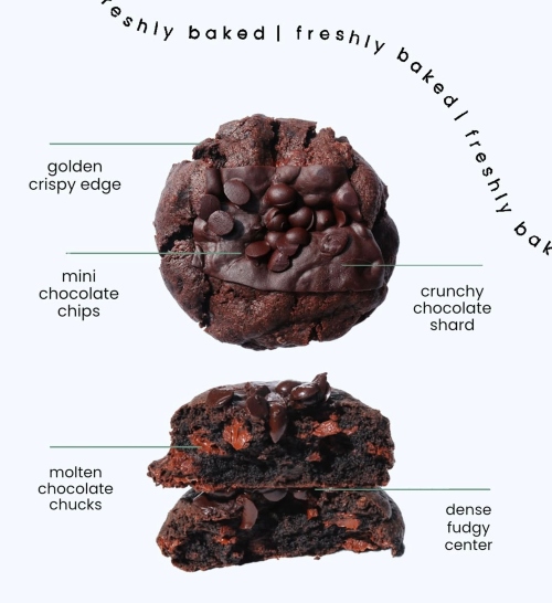 The texture leans perfectly gooey in the centre, with just enough crispy edges on the outside to hold it all together. Every bite feels rich, indulgent, and unapologetically decadent, with layers of chocolate coming through in different forms. It’s the kind of cookie that’s messy, satisfying, and completely worth it – especially if you’re craving something intensely chocolatey.