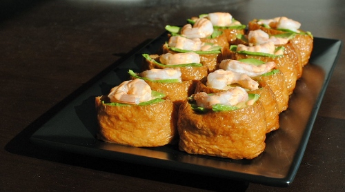 Inari or inarizushi doesn’t really have any fillings in it – rather, it consists of sushi rice which is placed in a pocket of deep-fried tofu. Before being stuffed with rice, the fried tofu is simmered in a sweet and savoury broth, which gives the sushi a simple yet umami-like flavour.