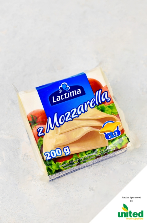 For this recipe we have used the Lactima z Mozzarella cheese slices, provided to us by one of our partners, United Foods Suppliers. These have a light creamy mozzarella taste, perfect for grilled cheese, sandwiches and easy pizzas.